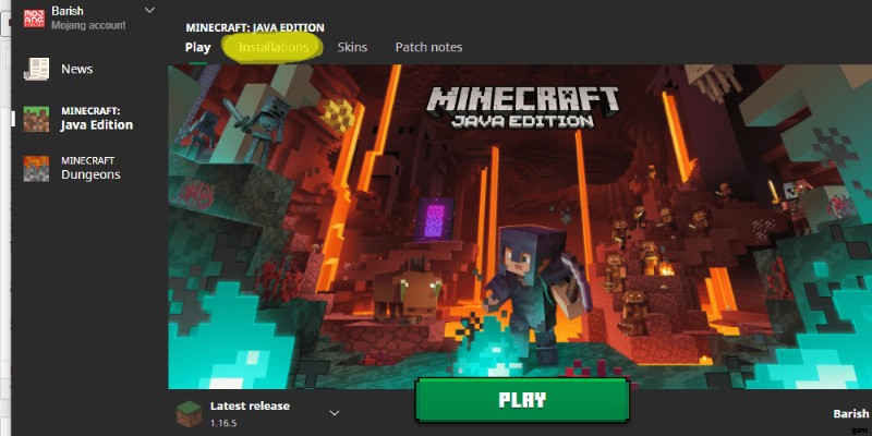 Minecraft を持っているとき ランチャーが開いたら、[再生] をクリックしないでください! インストールが見つかります 上部にあるタブ .見つけにくい場合は、上の画像で黄色に強調表示されていることがわかります。そのタブをクリックすると、 Minecraft のバージョンを選択するための選択画面が表示されます。 プレイしたいです。