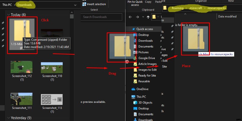 上の画像は、ダウンロード フォルダーからパック フォルダーにファイルをドラッグ アンド ドロップする方法を示しています。テクスチャ パックに必要な要素が含まれている限り、ゲームはそれをテクスチャ パックとして認識します。黄色で強調表示されているフォルダーのパスに注意してください。 フォルダをダウンロード フォルダからリソース パック フォルダにドラッグしてください。