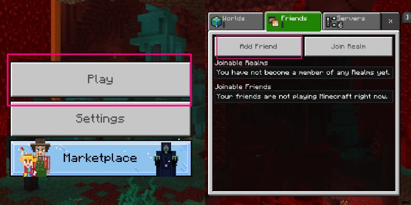 マインクラフトのおもちゃ、本、レゴ、その他の商品を見るそれが完了すると、複数のタブを持つ別のメニューに移動します。上部にある [フレンド] というタブに移動します 、上記の緑色で強調表示されています。次に、[友達を追加] をクリックします。 右上の画像でピンク色でハイライトされています。