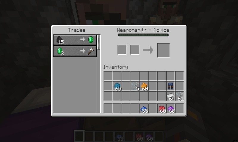 また、村人が特定の職業に属しているかどうかは、外見やこれらのブロックのいずれかに立っているかでわかります。また、彼らとの取引メニューを開いて、彼らの仕事を確認することもできます。下の画像に示すように、取引メニューの上部に彼らの仕事が表示されます。