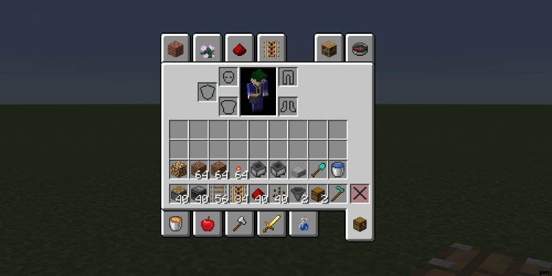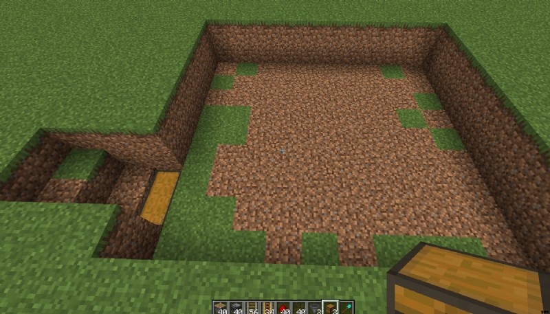 この穴はスーパーフラット ワールドで掘られたものですが、通常のワールド生成のサバイバル ワールドで掘ることになるので、あまりきれいにはいかないでしょう。上の画像の穴の主要部分は 10 x 9 x 2 ブロックです。長さ 9 マスの側面の 1 つで、コレクション システム用の余分なスペースを掘り出します。この余分なスペースのレイヤーは、上から下に 3 * 2、2 * 2、1 * 2 のパターンに従います。1 * 2 のスペースに、2 つのチェストを配置します。これは、収穫したメロンが表示される場所です。