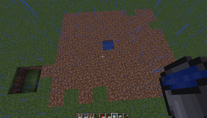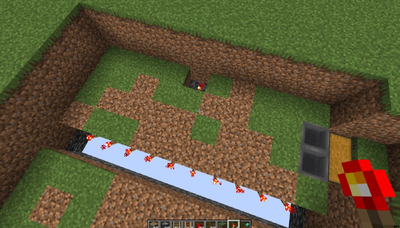 このステップは重要ですが、簡単です。レール全体を汚れで覆います。メイン広場の真ん中に穴を開け、その穴の下半分に手持ちのハーフブロックを置きます。次に、上半分に水を入れます。ガイダンスについては、上の画像に従ってください。