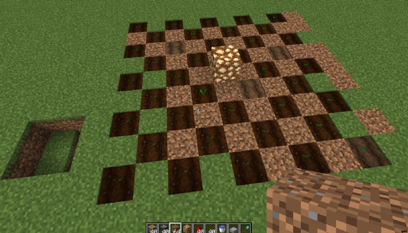 どこから始めればよいかわからない場合は、Glowstone ブロックから始めると、この手順に従うのが最も簡単になります。すべての方向で、ブロックをスキップして次のブロックまで。ここから 8 * 8 の正方形にチェッカーボード パターンを作成します。耕し終わったら、メロンまたはカボチャの種をすべての耕作地に置きます。