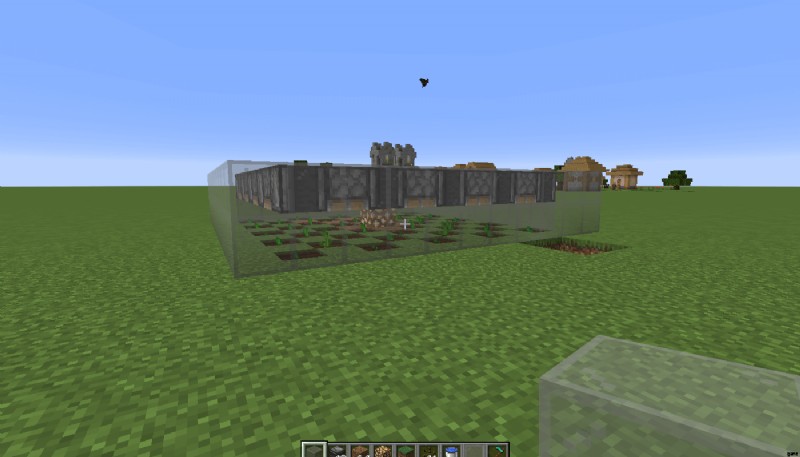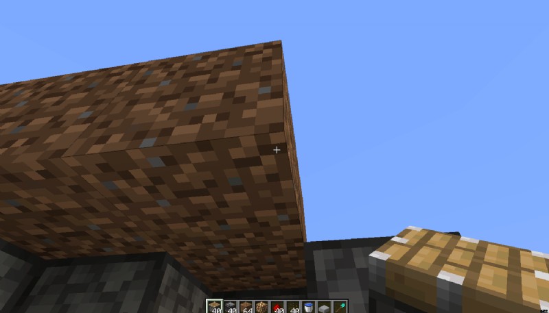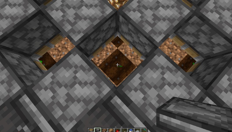 これらの次のステップは、ピストンが正しい向きになるように特定の方法で配置する必要があるため、少し注意が必要です。耕作も植え付けもされていないすべてのブロックの上にピストンを配置する必要があります。これを行うには、耕作地から 3 ブロック上の農場の上に一時的な天井を構築する必要があります。注:このキャノピーは、植物やグロウストーンではなく、地面自体の 3 ブロック上に構築してください。
