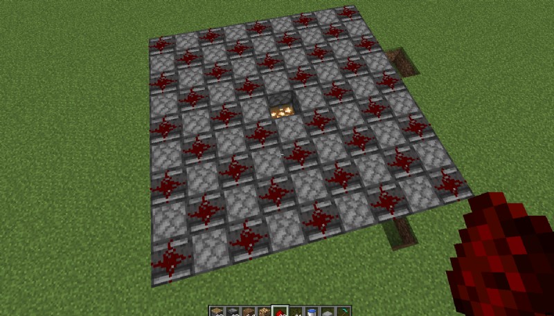 完了すると、ファームは上の画像のようになります。ピストンブロックの市松模様になりますが、植物の配置が逆になります。これらのピストンは、カボチャとメロンがその下のブロックに成長すると、それらを粉砕します.