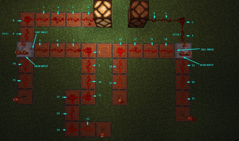 信号がサイド入力を通過すると、強度の数値も表示されます。 If どちらか一方の入力の強さ リア入力より大きい その場合、コンパレータの出力は 0 (信号なし) です。 背面入力の強度が両方の側面入力よりも大きい場合、 その場合、コンパレータの出力はリア入力の信号強度と等しくなります。
