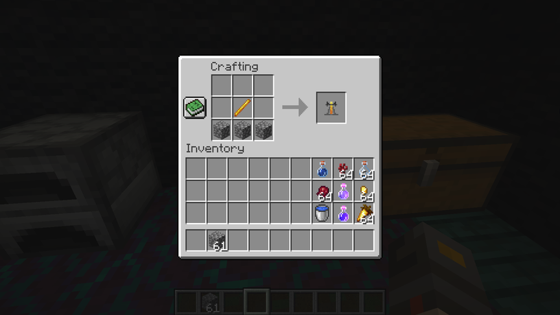 不可視のポーションを作るには、暗視のポーション (3.00) 1 つ、発酵したクモの目、ブレイズ パウダー 1 つが必要です。醸造台も必要になるので、まだ作成していない場合は作成してください。それを作るには、3 つの丸石ブロックと、上記の次のパターンで配置されたブレイズ ロッドが必要です。