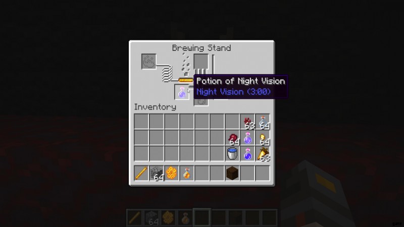 4つの素材をすべて集めたら、スタンドに戻し、以前と同じようにBlazepowderを配置することから始めます。次に、水のボトルを砂の左側のスロットにセットします。それが終わったら、一番上のスペースにいぼを置き、それが完了するのを待ってから、スロットが空になったら金のニンジンを置きます.醸造台でニンジンの調理が完了すると、ナイトビジョン ポーションの作成が完了します。