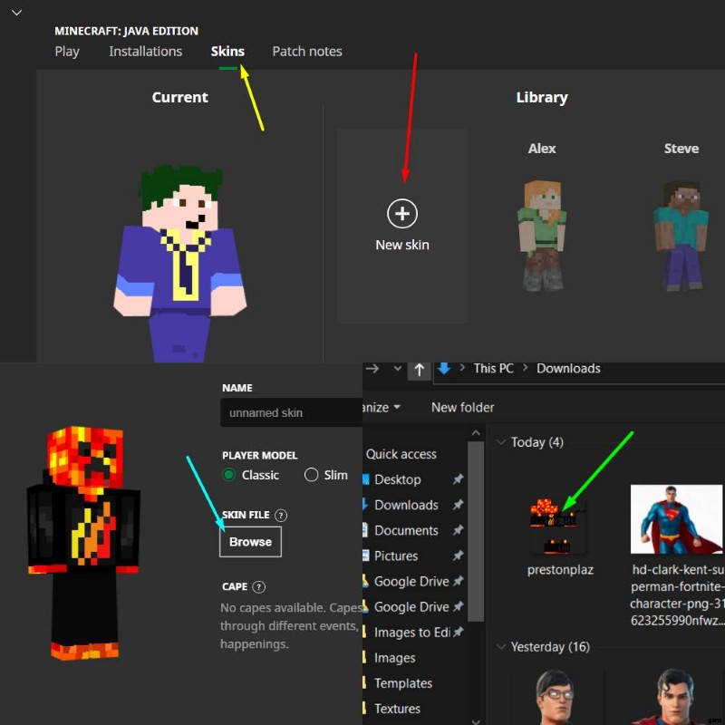 Minecraft へのスキンのインストールがこれまで以上に簡単になりました。ただし、これは Java バージョンの Minecraft でのみ機能することに注意してください。 現時点では、Bedrock Edition にカスタム スキンをインストールする方法はありません。スキンをインストールする手順を読んだら、画像を使用して以下の手順に従ってください。わかりやすくするために、手順は色分けされています。