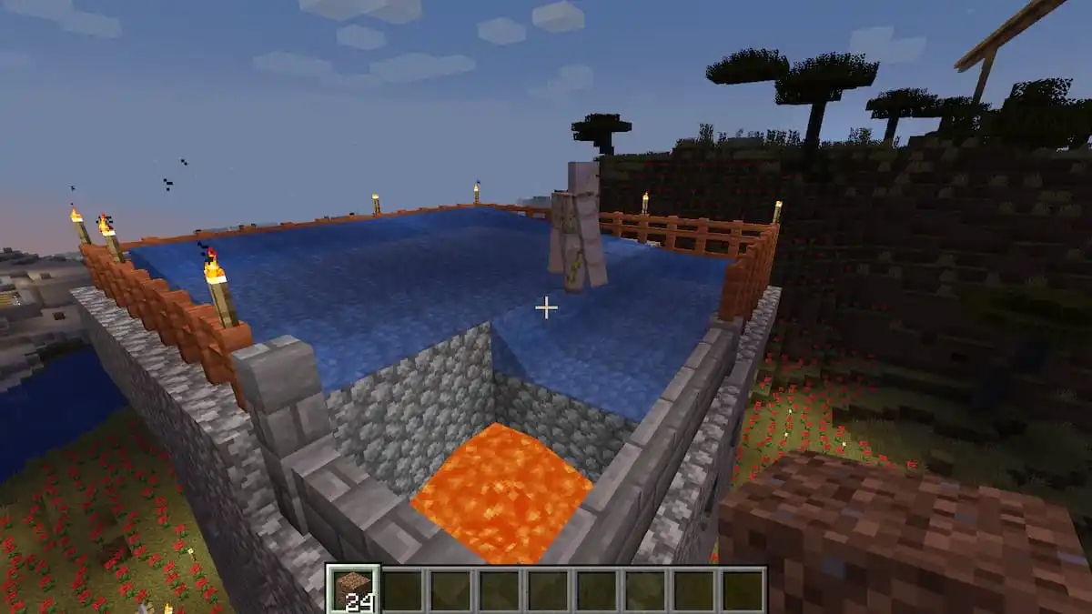 村人とゾンビの上にプラットフォームを構築します。これは、アイアン ゴーレムが強制的にスポーンされる場所です。水とフェンスを使って逃げるのを防ぎ、「溶岩の刃」に向かってゆっくりと滑り落ちさせます。