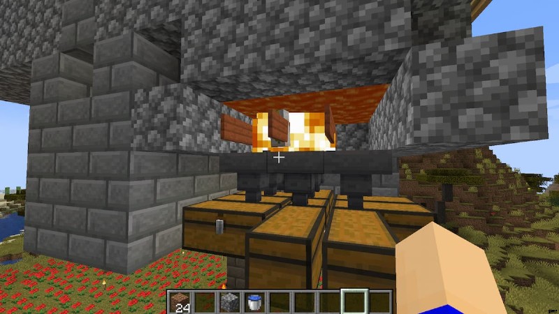 溶岩の刃は、開口部に標識を配置することで作成されます。溶岩は標識を通過できませんが、アイアン ゴーレムは通過できます。アイアン ゴーレムは溶岩によってダメージを受けますが、鉄のインゴットを下に落とします。チェストに接続されたホッパーを標識レイヤーの下に配置すると、鉄の農場が完成します。