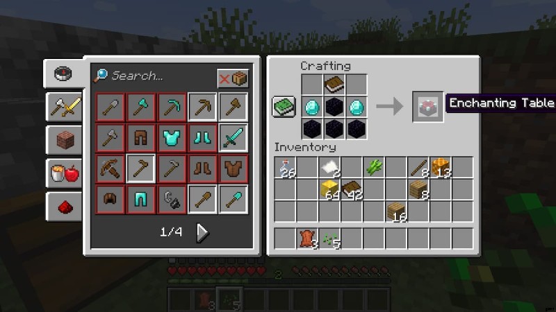 まずは必要な素材を集めます。たとえば、エンチャント テーブルには、2 つのダイヤモンド、4 つの黒曜石、および 1 つの本が必要です。