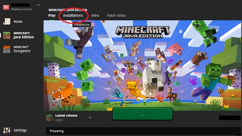 このバージョン番号を取得したら、Minecraft ゲームの代替インストールを作成します。これは複雑に聞こえますが、実際には非常に簡単で、Minecraft クライアント内で実行できます。まず、Minecraft ランチャーで、クライアントの [インストール] セクションをクリックします。