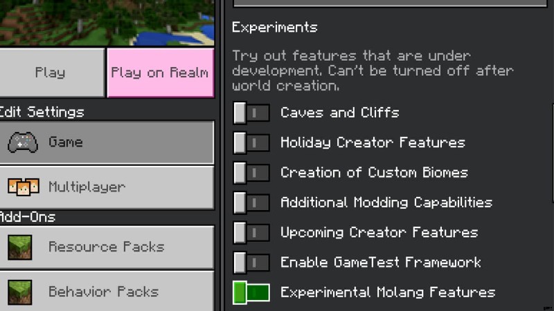 Vanilla Experiments を有効にするには、まず Minecraft の Beta Bedrock バージョンをロードする必要があります。 ゲームに入ったら、ワールドを作成するか、既存のゲームのワールド設定オプション メニューを表示する必要があります。