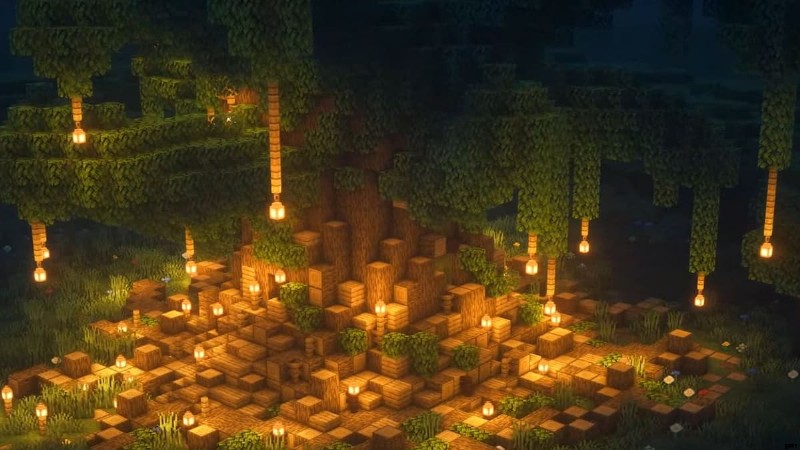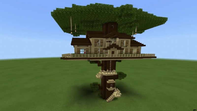 Heyimrobby によって設計されたこの趣のある建物は、屋根に葉が生い茂った、簡単に達成できる家庭的なコテージを作成します。複雑で美しく見えるかもしれませんが、初心者のプレイヤーなら誰でもこのツリーハウスを作ることができます。家の足元にブランコを追加すると、さらに暖かい雰囲気が生まれます。