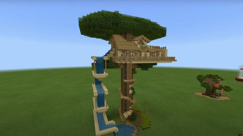 より冒険的でやりがいのあるビルドを探しているプレイヤーは、TSMC によるこのツリーハウス デザインを試すことを検討する必要があります。背の高い木に囲まれた平屋建ての家の側面から流れ落ちる大きなウォータースライダー。このツリーハウスは初心者向けではないかもしれません。