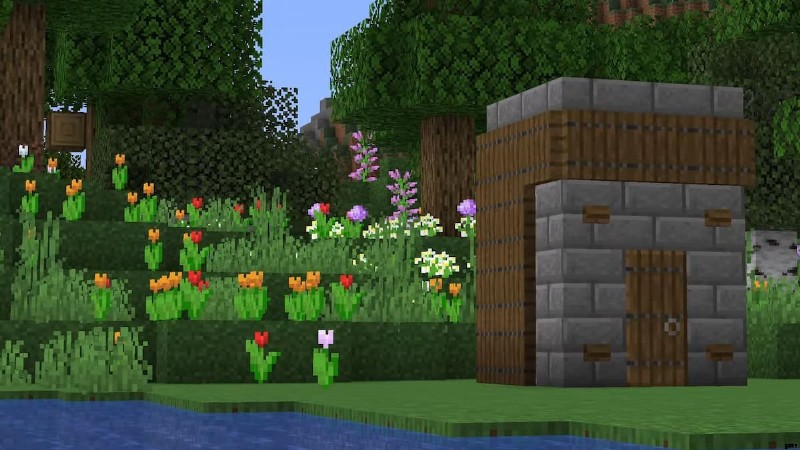 このマイクロホームを説明するには、単純なブロックが最適ですが、スペースが非常に少ない場合、選択肢は限られます。控えめな形は、このコンパクトな家の興味深いデザインと便利な機能によって補われています。このデザインは、窓や照明など余計な装飾を望まないプレーヤーに最適です。これは、多くの時間とスペースを節約する頑丈で伝統的な構造です。この非常にコンパクトな家のチュートリアルを自分で試してみてください. Additionally, consider placing this home against a hillside full of beautiful flowers, like in the image, to juxtapose the intense style of the architecture.