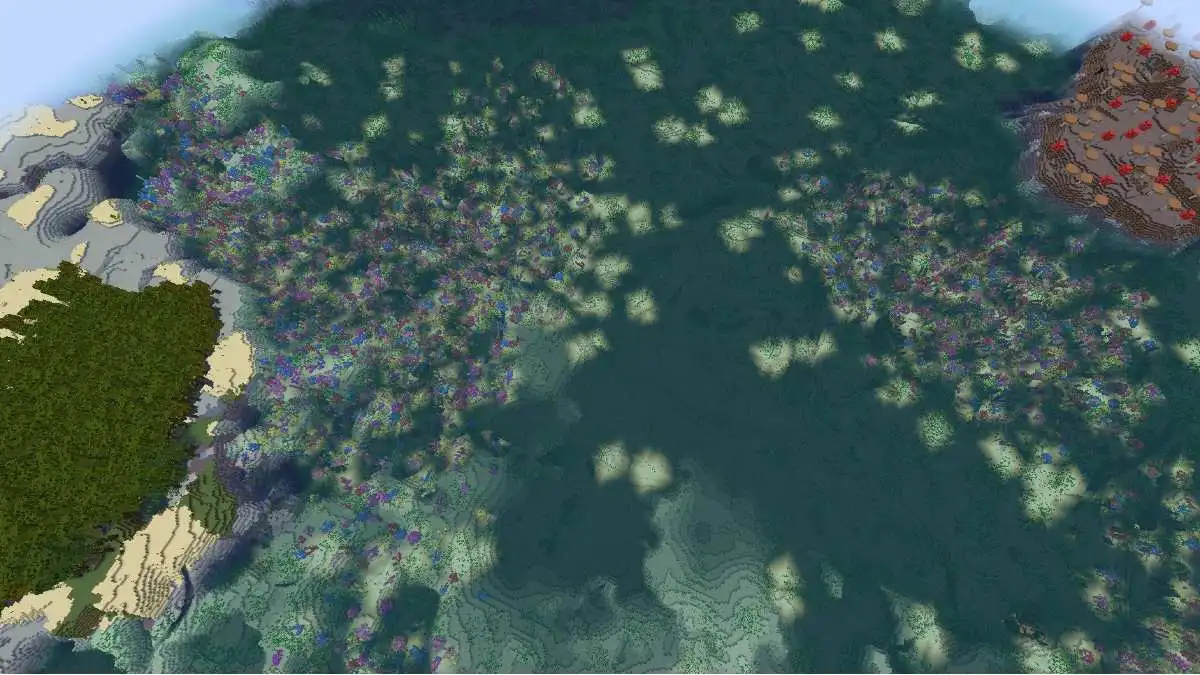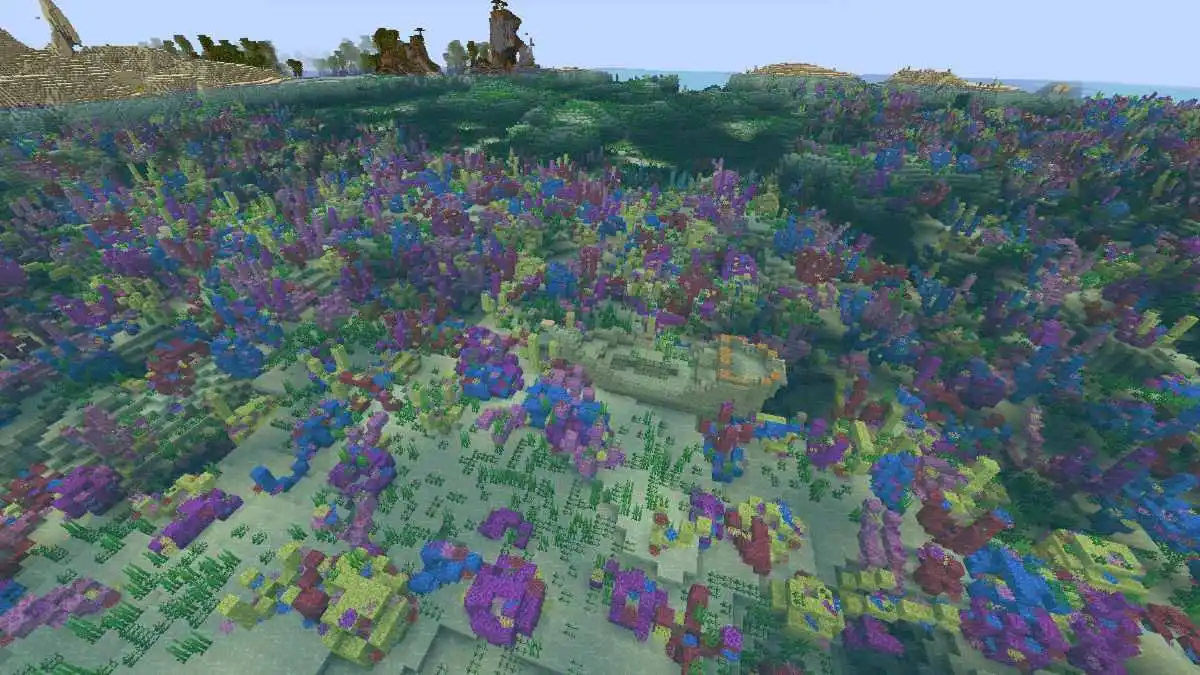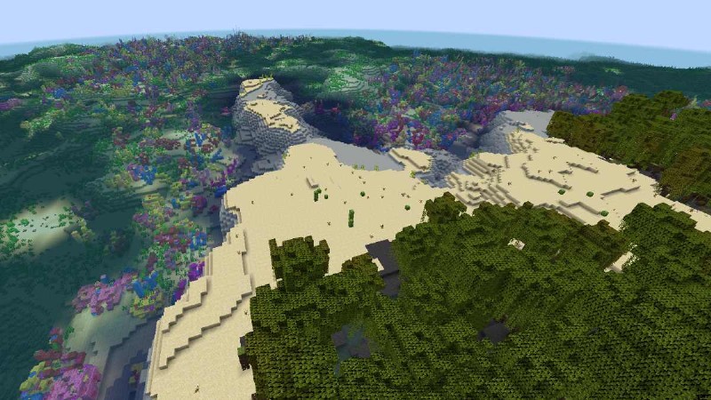 これは、スポーン時に無数の異なるレア バイオームの検索を満たす素晴らしいシードです。このシードのコーラル リーフは大きくはありませんが、シードの利便性とコーラル リーフのユニークな世界生成により、特筆に値します。緑豊かな洞窟 (レア) があるジャングル バイオーム (レア) の近くでスポーンし、ウッデッド バッドランド島 (レア) まで歩いて、周囲の雄大なサンゴ礁に飛び込むことができます!