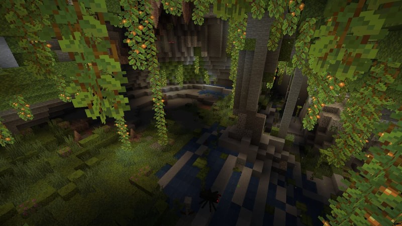 自然に育ったツツジの木が生い茂る森で産卵するということは、1 つのことしか意味しません。非常に浅い緑豊かな洞窟です。出発点からわずか数十ブロック下を掘ると、信じられないほど緑豊かな洞窟がいくつか見つかります。エンシェント シティは約 3000 ブロック離れており (1.19 のスポーンにはかなり適しています)、途中に魅力的な洞窟がたくさんあるので、これは本当に美しいスポーンです.