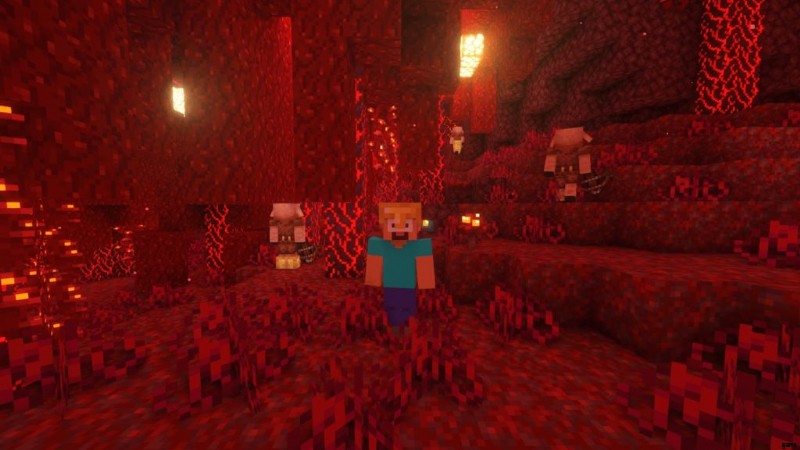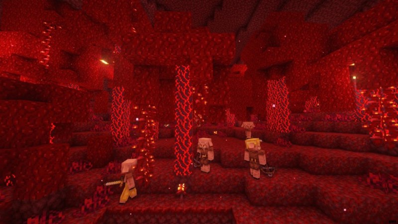 ネザー ポータルを構築し、フリントと鋼で照らします。では、足を踏み入れてください!真紅の森 (濃く濃い赤の霧が立ち込める赤く暗い森) または非常に一般的なネザー ウェイストを探します。
