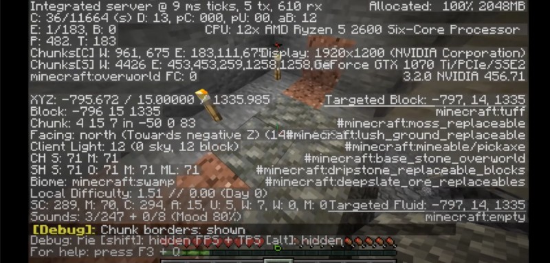 Y=11 でダイヤモンドを採掘している場合は、次の手順に従って探しているものを見つける必要があります。 Y=11 に凝灰岩が見つかった場合は、凝灰岩ブロックの上部周辺のブロックの小さな領域を一掃します。いくつかの領域をクリアしたら、F3 を押してチャンクの境界を表示します。