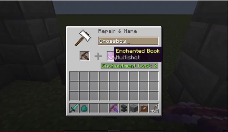 - 金床に行き、エンチャントされた本とクロスボウを組み合わせて、マルチショット エンチャントを手に入れましょう。