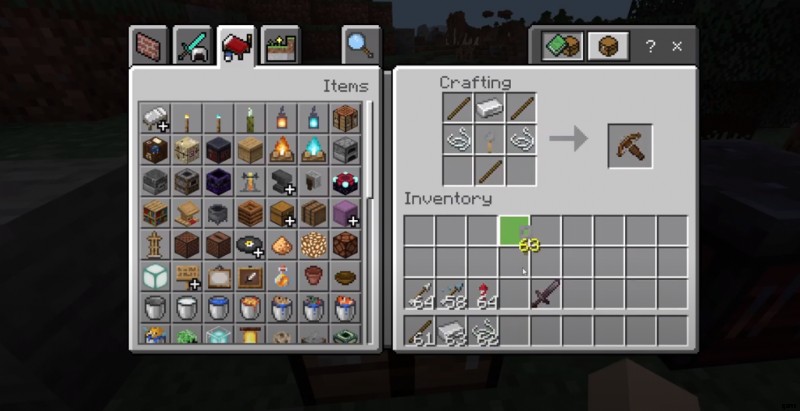 クロスボウを作成するには、棒 3 本、糸 2 本、鉄インゴット 1 つ、トリップワイヤー フック 1 つが必要です。必要なリソースがすべて揃ったら、以下に示すパターンを使用して、これらを作業台に置くことができます.すぐにクロスボウを手に入れることができます。