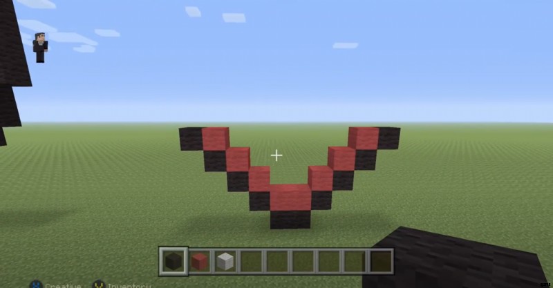 - 次に、4 つの斜めの赤い羊毛ブロックを上向きに、既に配置した黒い羊毛ブロックの上に配置します。