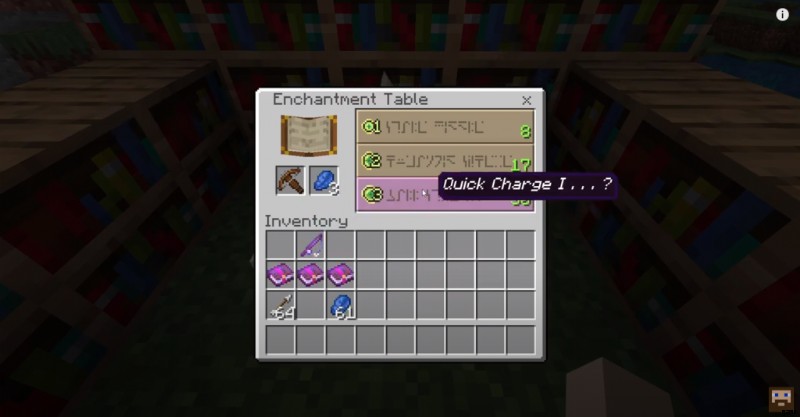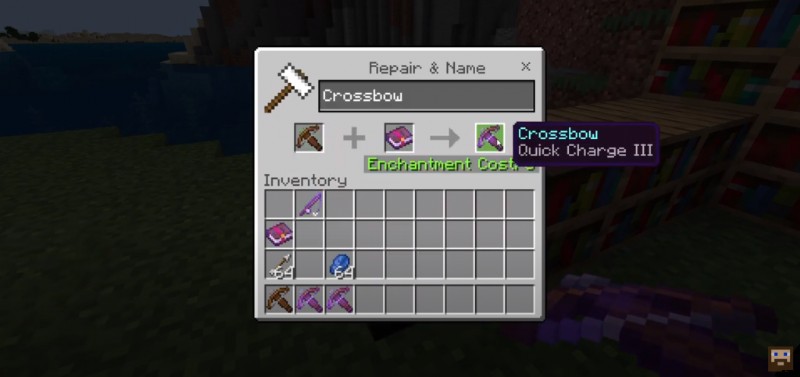 - クロスボウをクイック チャージ II および III の本と組み合わせて、クロスボウにエンチャントを適用できます。
