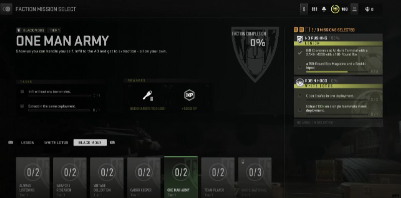 チームメイトなしで侵入し、同じ展開で脱出することは、Black Mous 派閥の One Man Army Tier 1 ミッションの一部です。 ブラック マウス派閥は、レギオンとホワイト ロータスのティア 2 ストーリー ミッションを完了することによってのみアンロックできます。 Black Mous ファクションのロックを解除すると、One Man Army Tier 1 ミッションを完了できます。