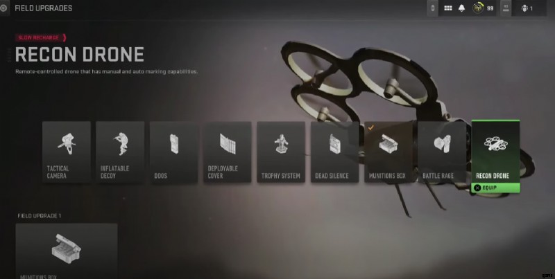 偵察ドローンを入手したらすぐに、フィールド アップグレードに移動してドローンを装備してください。