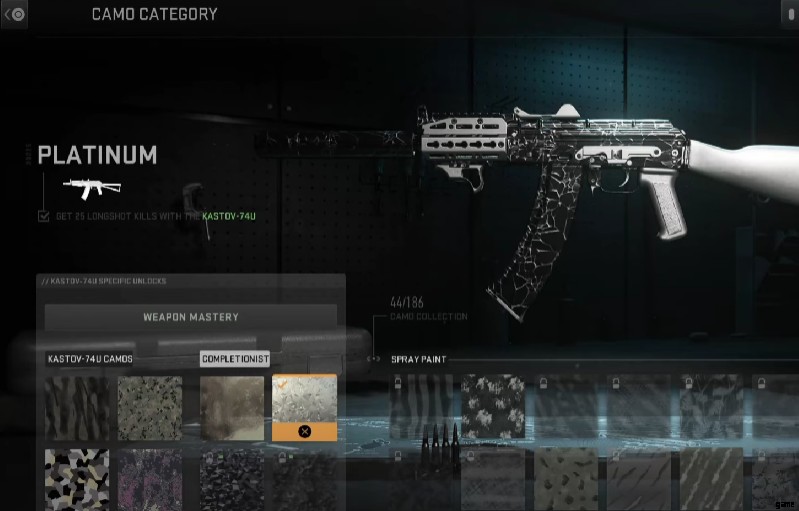 - Kastov 74U のプラチナ迷彩チャレンジは、Kastov 74U でロングショット キルを 25 回達成することです。
