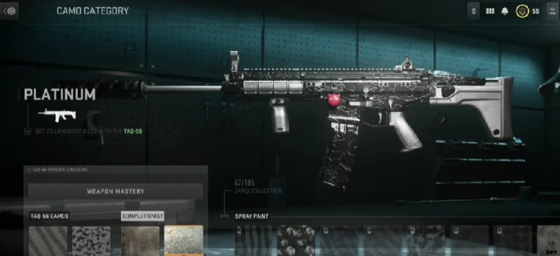 - TAQ-56 のプラチナ迷彩チャレンジは、TAQ-56 でロングショット キルを 25 回達成することです。