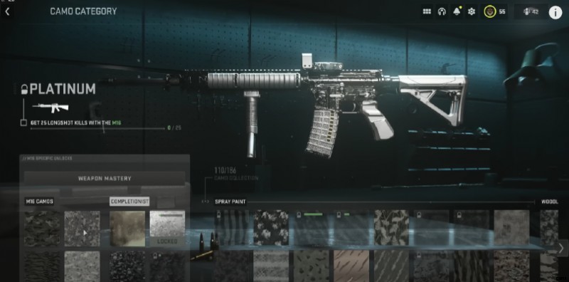 - プラチナ迷彩チャレンジを完了すると、M16 にプラチナ迷彩を装備できるようになります。