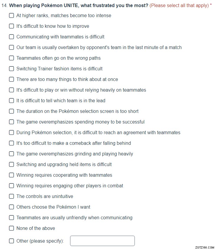 昨日、ポケモン UNITE Twitter は、ゲームに関するフィードバックを求めるアンケートを投稿しました。セクションの 1 つは、プレイヤーがゲームで最もイライラしたことは何かを尋ねます。また、プレイヤーが同意するであろう多くの選択肢がリストされています。