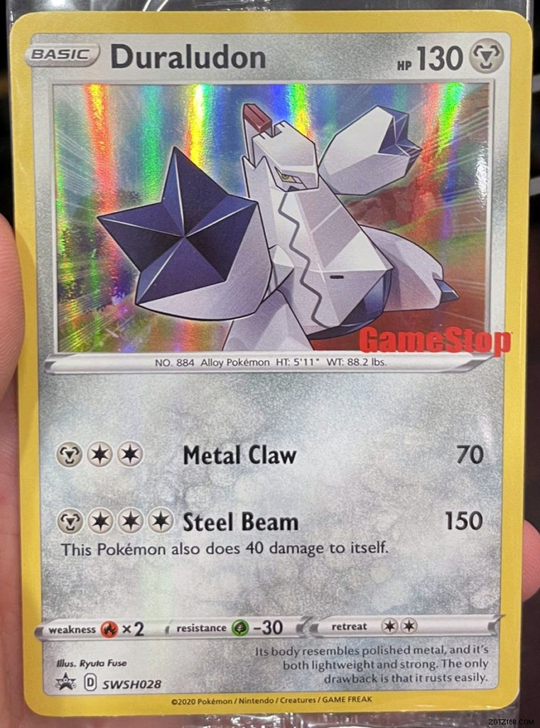 今日オンラインで共有されたカードは、この新しいセット全体で際立って登場するデュラルドンにほかなりません。これは GameStop のロゴが刻印されたホログラフィック カードであり、プロモーションの場合は、以前のカードが黒い刻印を誇っていたのに対し、赤になっています.