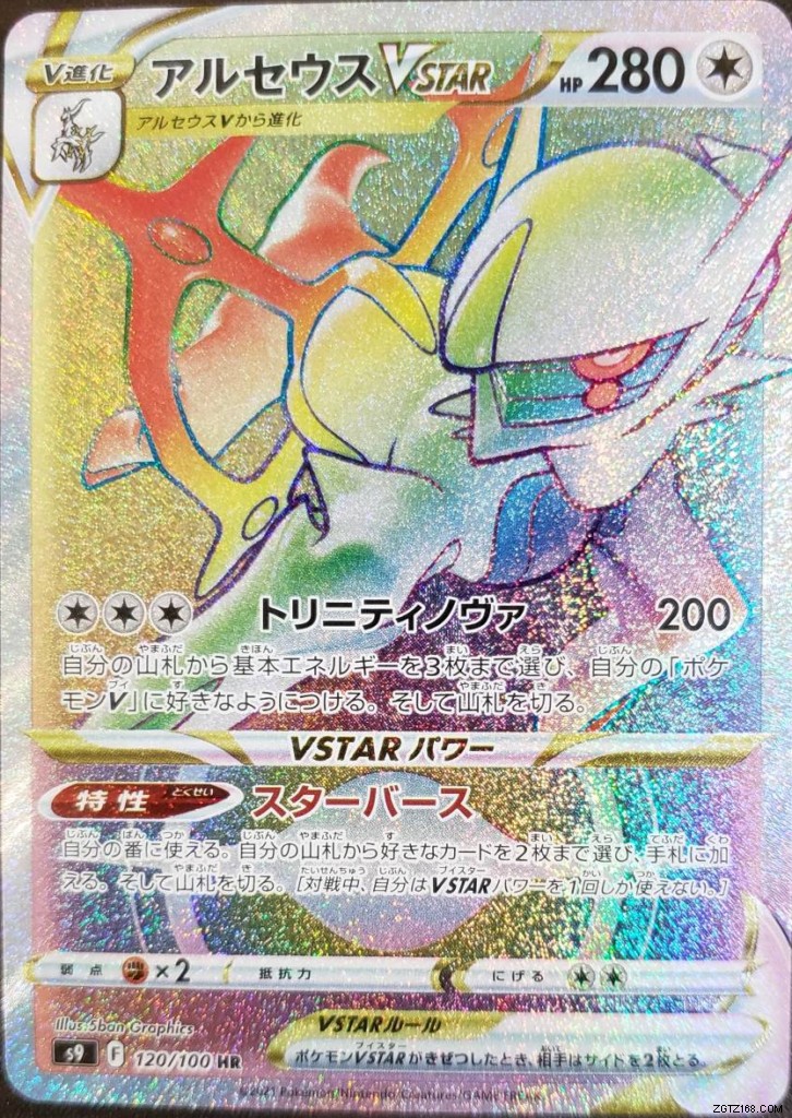 アルセウス Vスターのシークレット レアは、ゴールド スタイルのカードに似ており、レインボー レアのバリエーションもあります。