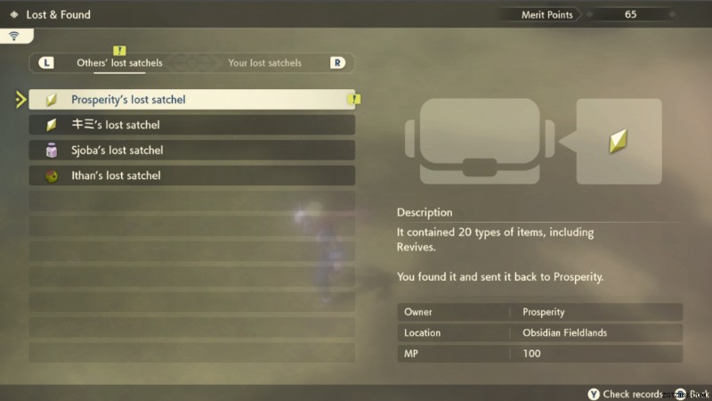 かばんを返却すると、ランダムな量のメリット ポイントが付与されます。ポイントはだいたい 50 から 100 MP です。また、サッチェルを返却するとアイテムが与えられます。これは、返却した人の名前の横に記載されています。