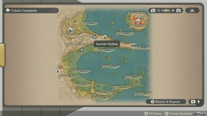 ポケモンと一緒にコバルト コーストランドにいる間は、夕方まで待ち、コーストランド キャンプの近くにあるシーズ ゲートと呼ばれる 2 つのはさみ型の岩を通り抜けます。ゲートを通過すると、ダイアログ キューが表示されます。