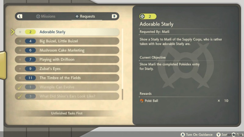 まだ完了していないリクエストの数を確認したい場合は、スイッチの – ボタンを押すと、マップが表示されます. Y をタップしてミッションとリクエストを表示し、R ボタンをタップして現在のすべてのリクエストのリストを表示します。また、完了済みのリクエストを確認することもできます。これは、すでに完了していることを示すためにチェックされます。