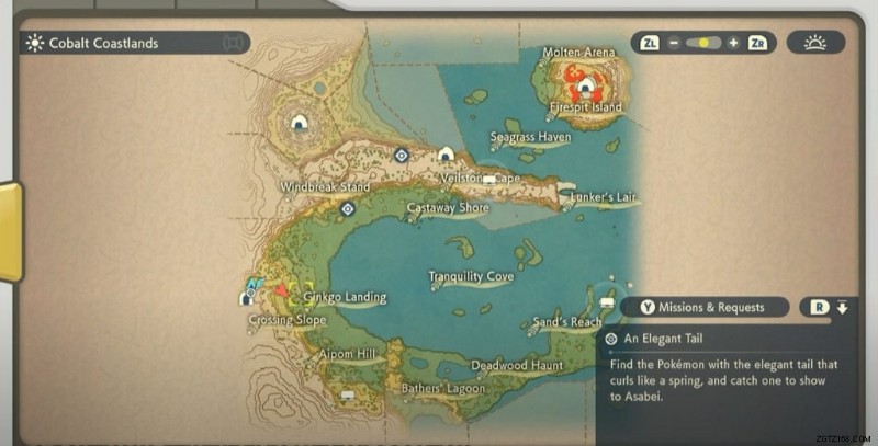 これは、プレイヤーがジュビライフ村の郊外にあるアサベイという名前の NPC に話しかけるエレガントなテール リクエストの場合です。アサベイは、近くで見つけた注目すべきポケモンのしっぽの話でプレイヤーを楽しませます。