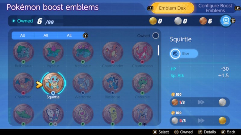 各レアリティの各ポケモンのエンブレムの数など、ブースト エンブレムのコレクションを簡単に表示できます。この画面から直接アップグレードすることもできるので便利です。
