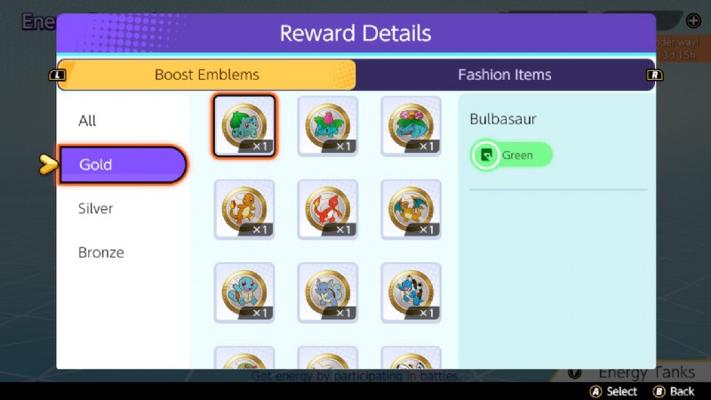 各ブーストエンブレムはポケモンに基づいており、レアリティと色に分かれています.レアリティはブロンズ、シルバー、ゴールドの3種類、カラーはレッド、ブルー、イエロー、グリーン、パープル、オレンジ、ピンク、ブラック、ホワイトの9種類。