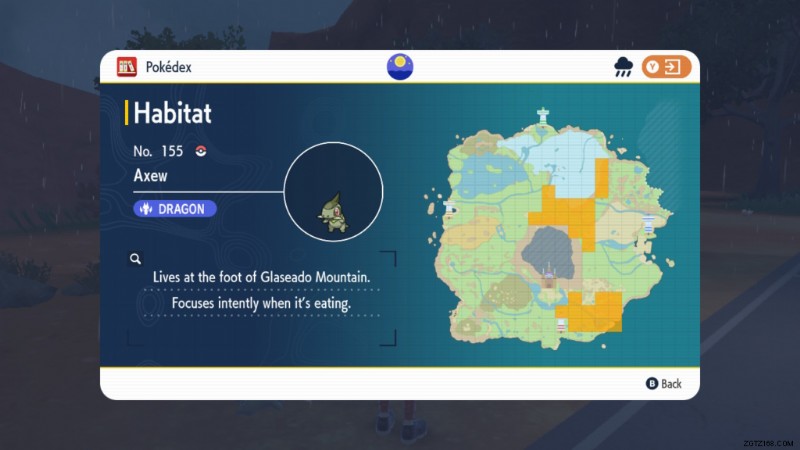 ゲームの後半まで待って Axew をチームに追加したい場合は、そうする機会がたくさんあります。ドラゴン タイプは、グラセアド山の南、および上記のマップでハイライト表示されている他のいくつかの地域にもスポーンします。