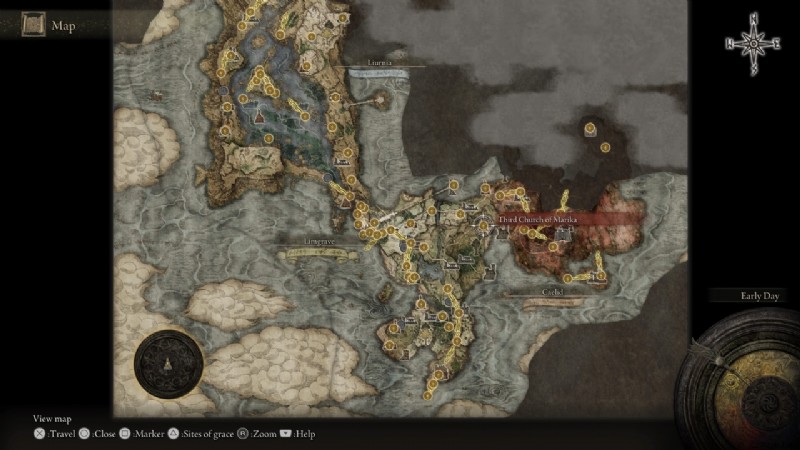 フラスコの存在はかなり早い段階で示唆されています。プレイヤーがチュートリアル エリアを離れると、エレー教会に向かいたくなるでしょう。彼らは武器をアップグレードする場所を見つけますが、トレジャーハンターにとって特に役立つ商人であるカレにも会います.彼はたまたまフラスコ オブ ワンダラス フィジックについてのメモを販売しており、購入するとその場所がマリカ第三教会内であることが明らかになります。 .この教会はリムグレイブの東側にあり、地図に表示されている道をたどっていくと見つけることができます。プレイヤーが入ると、プレイヤーが簡単に入手できるように、フラスコは無防備に置かれます。