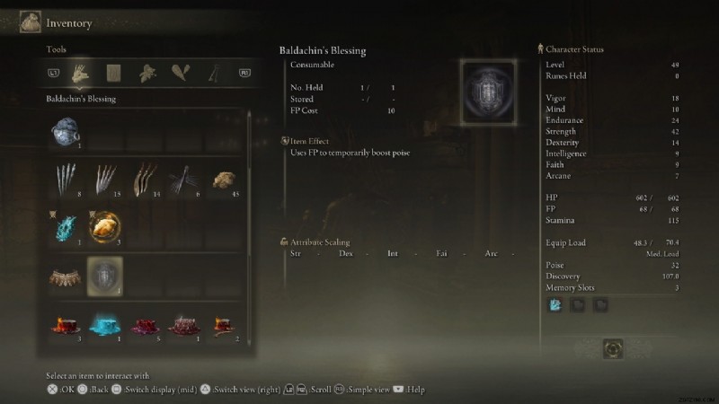 フィアは必要なだけあなたを抱きしめてくれると言っているので、バルダキンの祝福を補充するために、ラウンドテーブルホールドを頻繁に戻すことを恐れないでください. Elden Ring のボスの多くは、Poise が低すぎるとよろめいてしまうような長い一連の攻撃を持っています。Baldachin's Blessing を所持していると、ゲームの最も厳しい戦闘中に平静を保つのに役立ちます。ラウンドテーブル ホールドに立ち寄って武器のアップグレードやその他のことをするときはいつでも、必ず彼女を訪ねてください。 Fia のサービスは無料で、ハグが必要な場合もあります。
