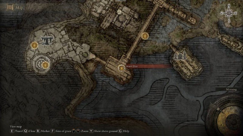 Radha を倒したら、Fort Haight Site of Grace に移動します。 ミストウッドの南にあるリムグレイブ。そして、ラダーンを倒した後、空から落ちてきた落ち星が作ったクレーターに飛び込む。 永遠の都ノクロンに移動します 、そしてミミックティアと呼ばれるボスと戦う必要があります 召喚の灰を要求する前に、ノクロンの夜の聖地エリアで。ミミック ティアの正確な位置は、下の地図で確認できます。