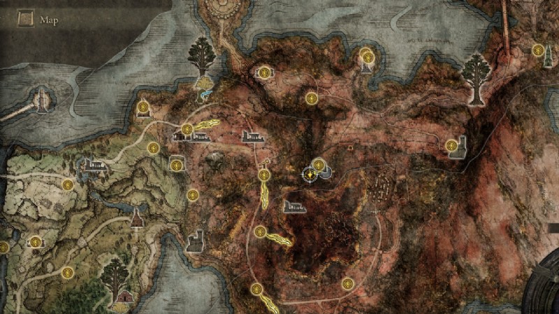 廃墟の洞窟でボス戦となる2人のCleanrot Knightを倒すと、金のスカラベが授与されます。 カエリッドで。洞窟にたどり着くには、くすぶっている壁から東に行く必要があります 道路沿いの望遠鏡のすぐ近くにあるサイト オブ グレース。峡谷の端には、根が開口部に向かって伸びているのが見えます。それらの根を慎重に横切ると、放棄された洞窟に入ります。ここには、休むための別のサイト オブ グレースがあります。下の地図で洞窟の正確な位置を確認できます。