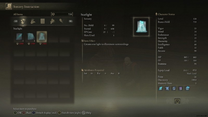 これは大した量のルーンではなく、最も基本的な黄金のルーンでさえ 10 個以上のルーンを提供します。ルーンを Thops に寄付することを選択した場合、Thops はいくつかの魔法の呪文を販売します。あなたが占星術師として始めた場合、彼が販売する3つの呪文のうち2つを持っているでしょう. 3番目の呪文は、非常に低いFPコストで唱えることができる単純な光の呪文です.これは、FP コストがなくても同様に機能するランタンに出会うまで、一部の人にとっては便利です.