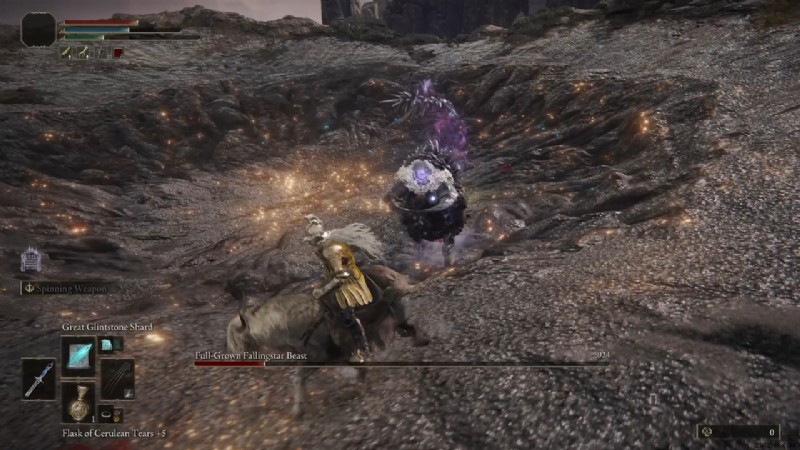 Full-Grown Fallingstar Beast は前方に突進するのが好きで、多くの場合、1 回のバーストで 3 回突進します。さらに、ボスははさみのような顎を地面に突き刺すことができます。その時点で、破片を避けるために横に移動する必要があります。この攻撃は、Torrent から離れると簡単にかわすことができます。